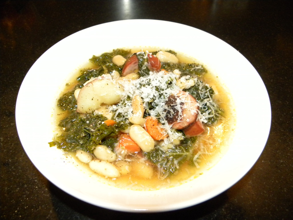 Stir carrots into soup and simmer five minutes. Stir in kale, sausage and remaining quart of water and simmer, uncovered, stirring occasionally, until kale is tender, 12-15 minutes.
