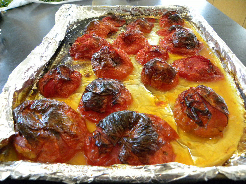Roast in hot oven for 1 hour to 1 1/2 hours, until tomatoes are cooked and the skins are nicely charred.
